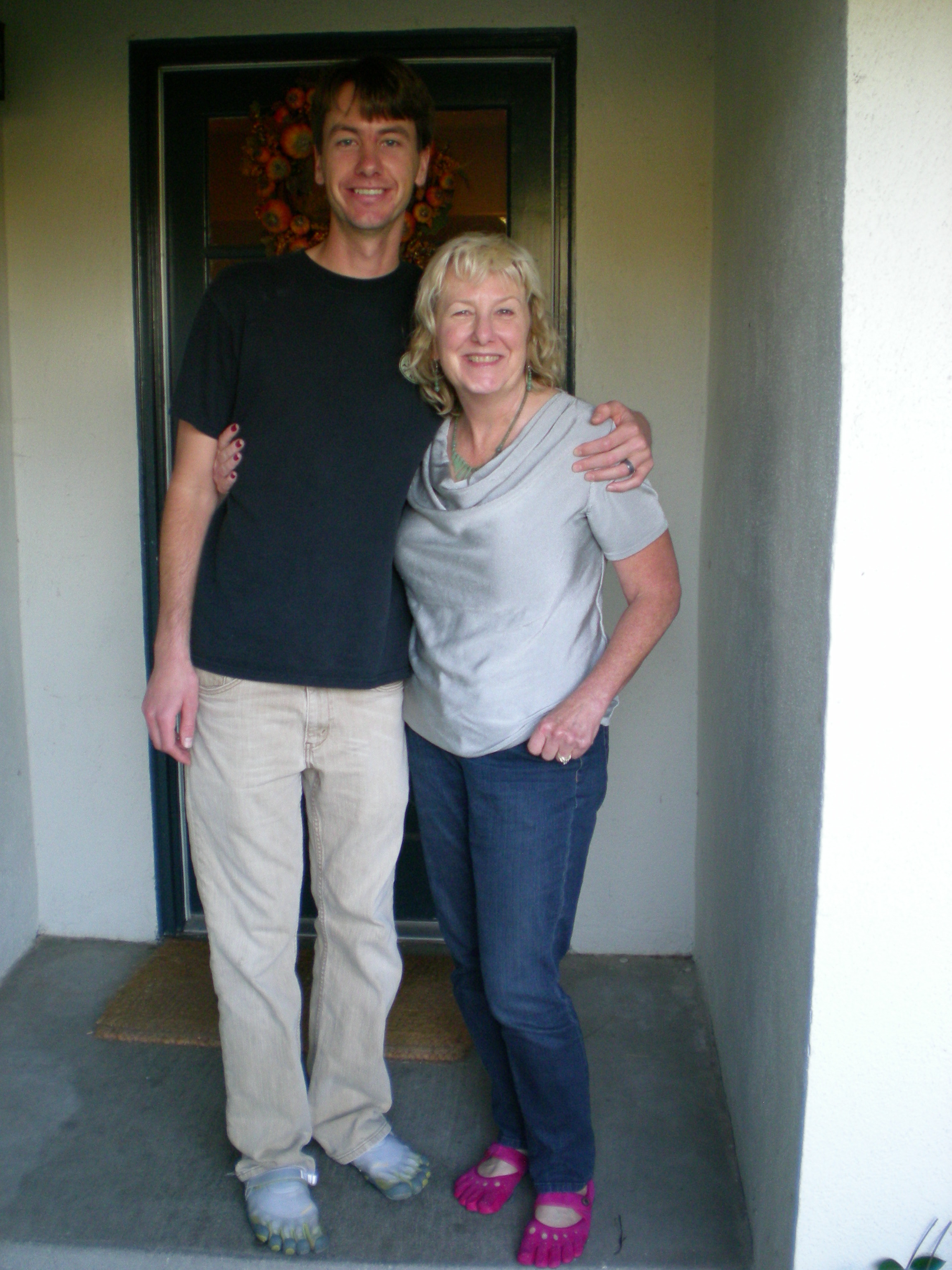 Last weekend the family was over. My MO (Middle Offspring) came over in his VFFs in a show of solidarity (or as proof that insanity runs in families). Here’s a shot of both of us rocking our VFFs.