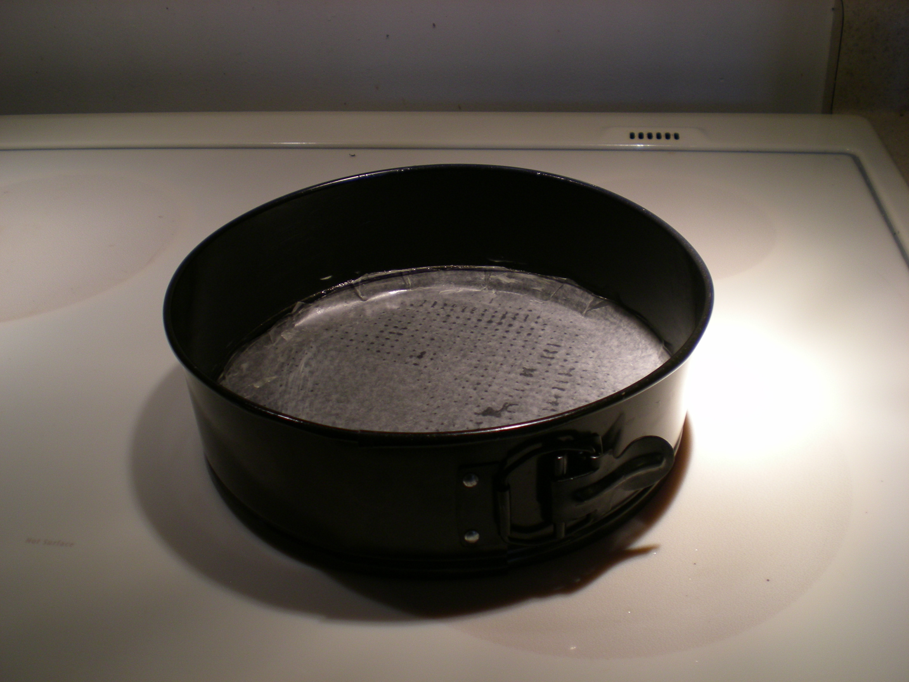 Preheat the oven to 350 F.  Grease the sides and bottom of a 9-inch springform pan, and line the bottom with parchment or wax paper.  Grease the paper.