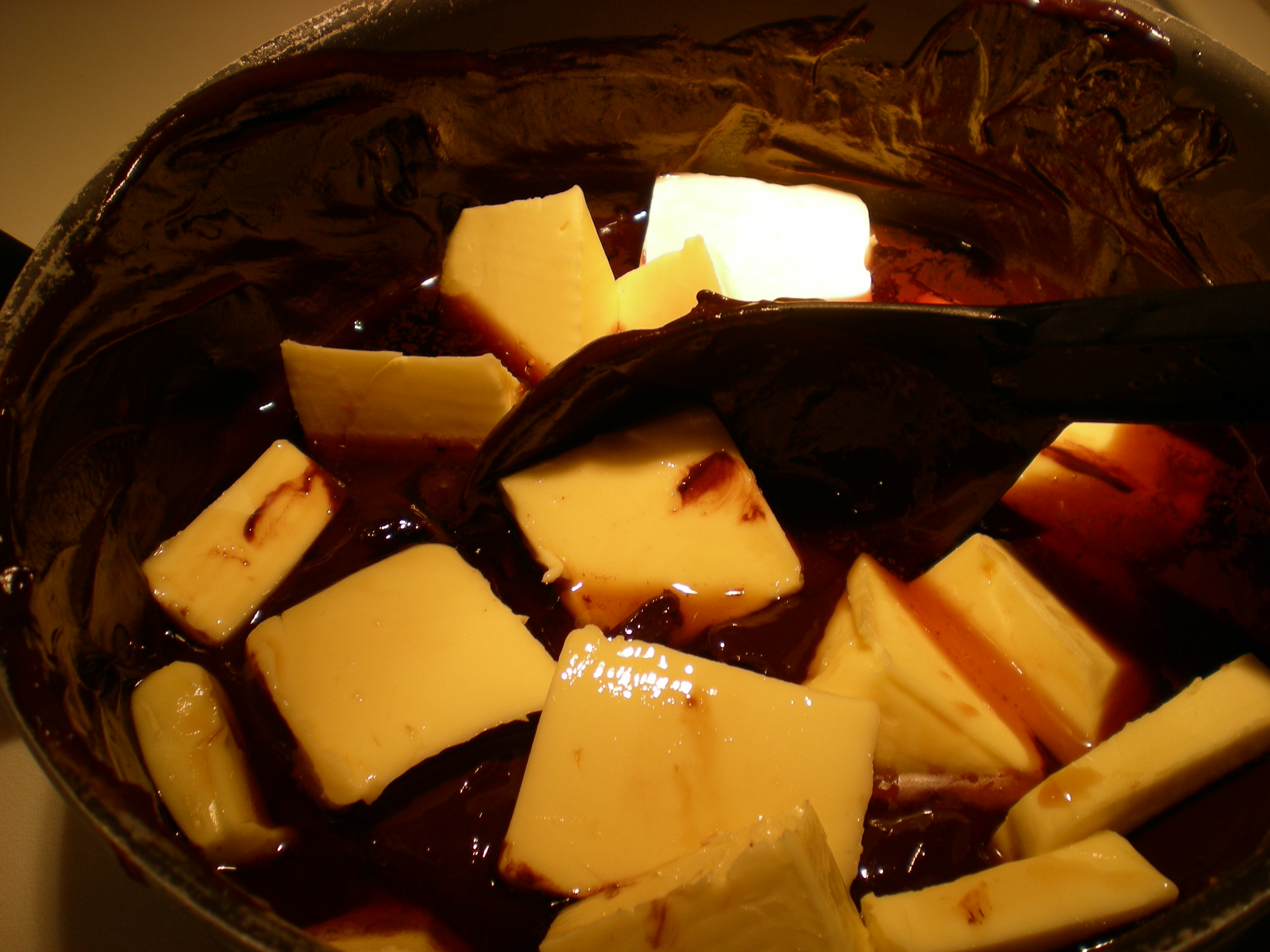 Add the vanilla, liqueur, and butter and stir until smooth.  Mix in the eggs.