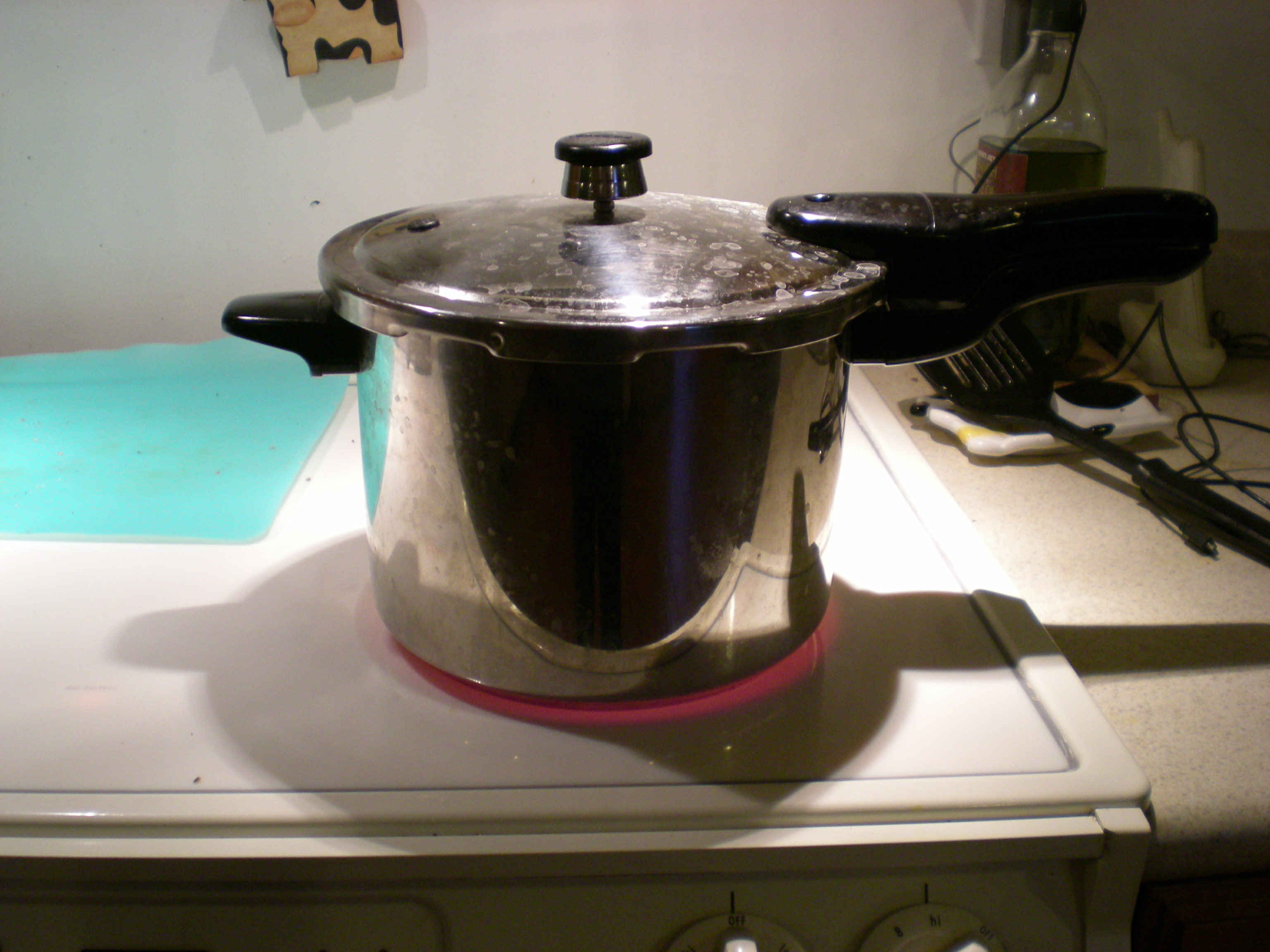 Lock the lid into place and bring up to pressure on high heat. As soon as the pressure is up, reduce the heat to the lowest possible setting to stabilize and maintain the pressure (on my stove this is medium).