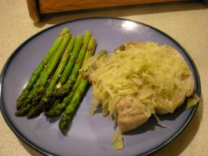 Cook 12 minutes. Remove from heat and use the natural release method before opening the lid (let the pressure reduce on its own). Serve the pork chops topped with the sauerkraut along with your favorite vegetable for a delicious meal. We had Roasted Asparagus.