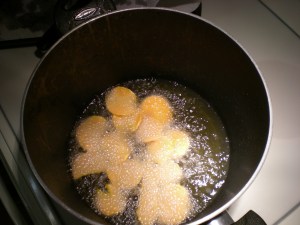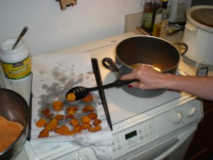 Melt ½” of coconut oil in a large pan. The tall sides will help contain the oil. Heat the oil to 350 degrees. Place a single layer of the sweet potato slices in the water and cook until they are browned and bubbles are no longer coming off the slice (one source I read said you need to do this to ensure the water is out of the potato slice).