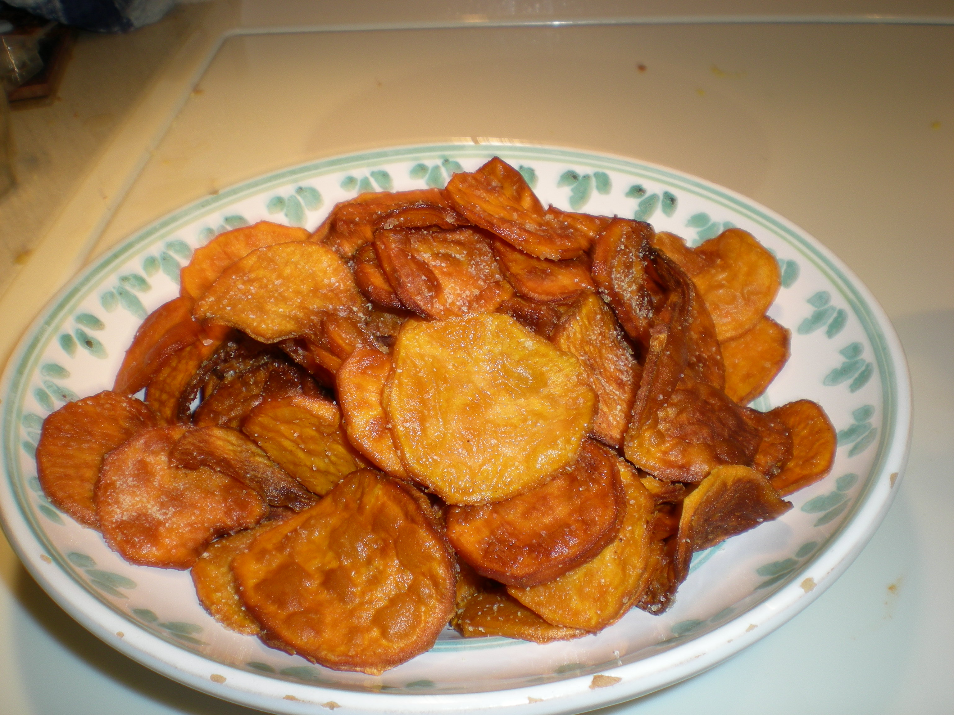 I have to make a confession here. Some of the chips were nice and crisp. I attribute this to learning the trick with the bubbles. I made a fatal error after the chips had cooled. I placed all the chips into a plastic bag. There was a mixture of both crisp, and not crisp chips. While they were stored in the bag together, the moisture level equalized and softened all the chips. TMOTH had the brilliant idea to try to put the chips in the dehydrator to see if that would fix the problem. It didn’t. The chips got tougher, but not crispy. They taste great, but the potato chip crunch I was craving is not there.