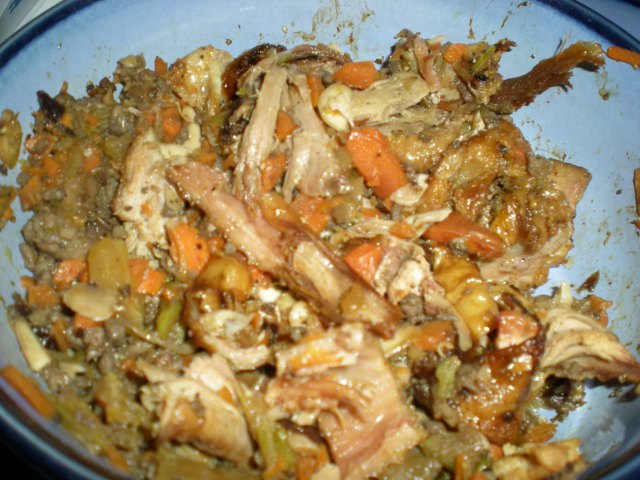 The stuffing was remarkably delicious and actually very close in texture and taste to the stuffing I have made in the past. It contained sausage, celery, carrots, onions, mushrooms, dried cherries, sliced almonds, chicken stock, sage and thyme (and maybe garlic powder).