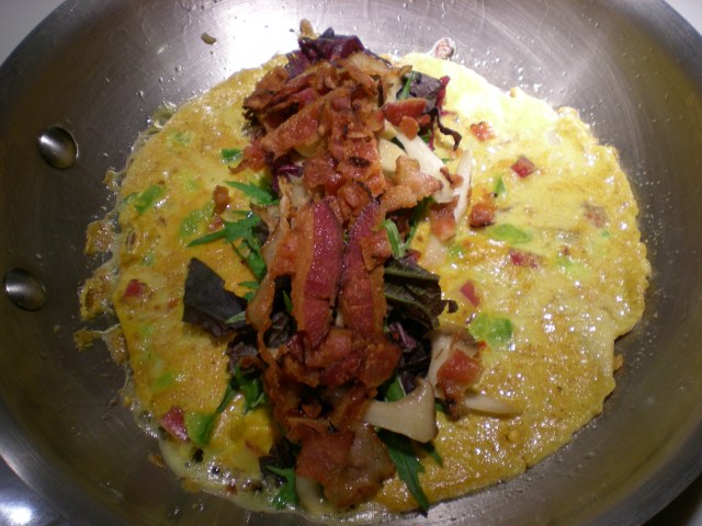 The omelet is a western style omelet with green bell peppers and onions cooked into the egg. It’s filled with mixed field greens, bacon and trumpet mushrooms from the CSA box. It was FABULOUS!