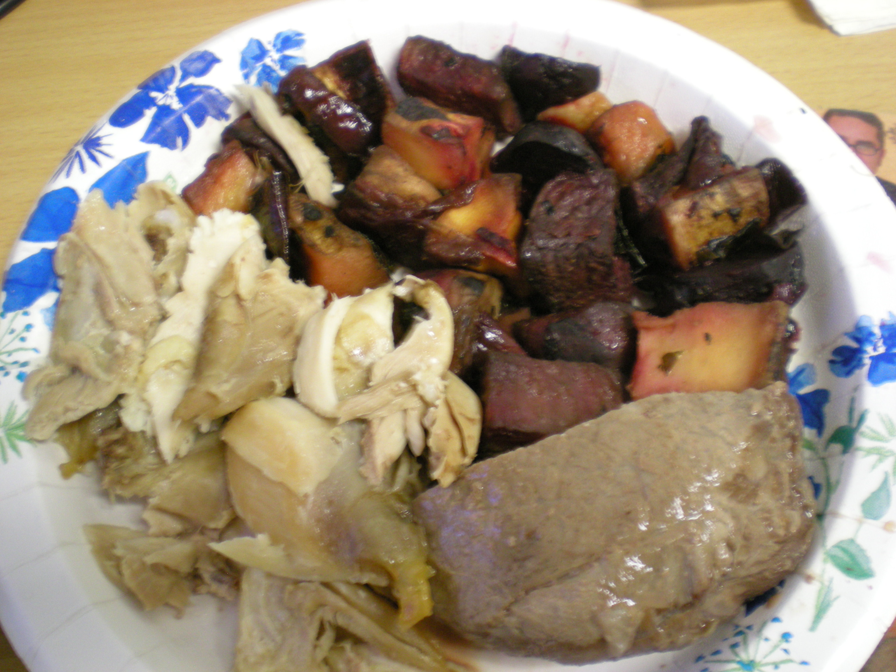 Lunch at my desk was comprised of a medley of leftovers. I had Roasted Root Vegetables, featuring beets from the CSA box. There was also Lemon Chicken from Tara Firma Farm and Beef Cross Rib Steak from the John Ford Ranch. I used my homemade garlic-rosemary mayonnaise as a sauce for the beef. I am drooling just remembering…