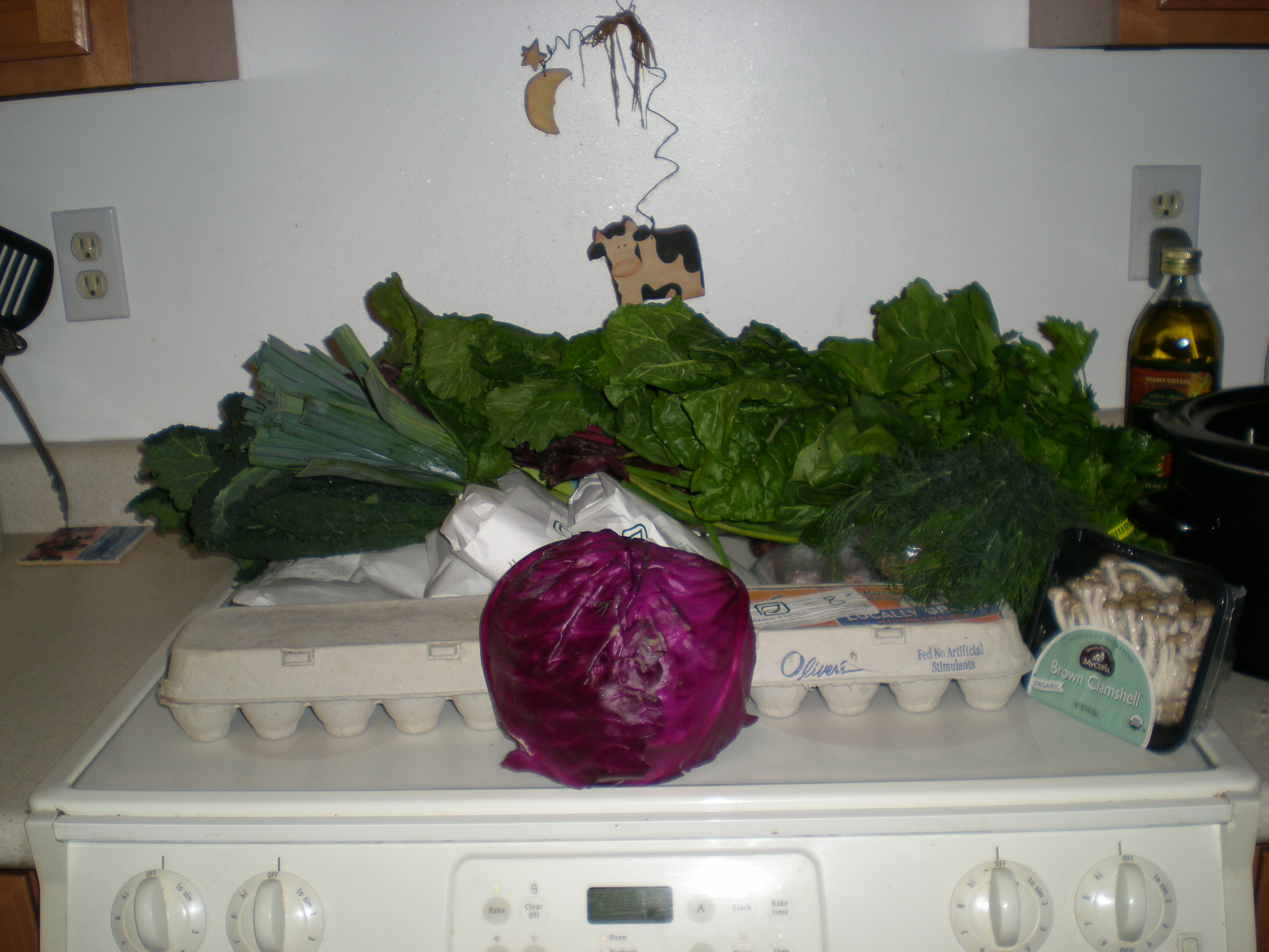 - Omelets stuffed with spinach and brown clamshell mushrooms (ON (Oldest Nephew) will have to fend for himself. He doesn’t like eggs)