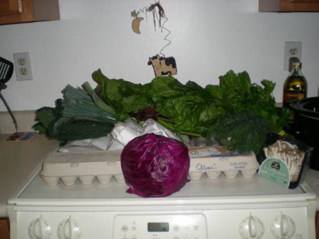 Here’s what we got this week in our meat and veggie shares from Tara Firma Farms. It also looks like my whining emailing to ask about our egg share has resulted in the bonanza of 2 dozen eggs.