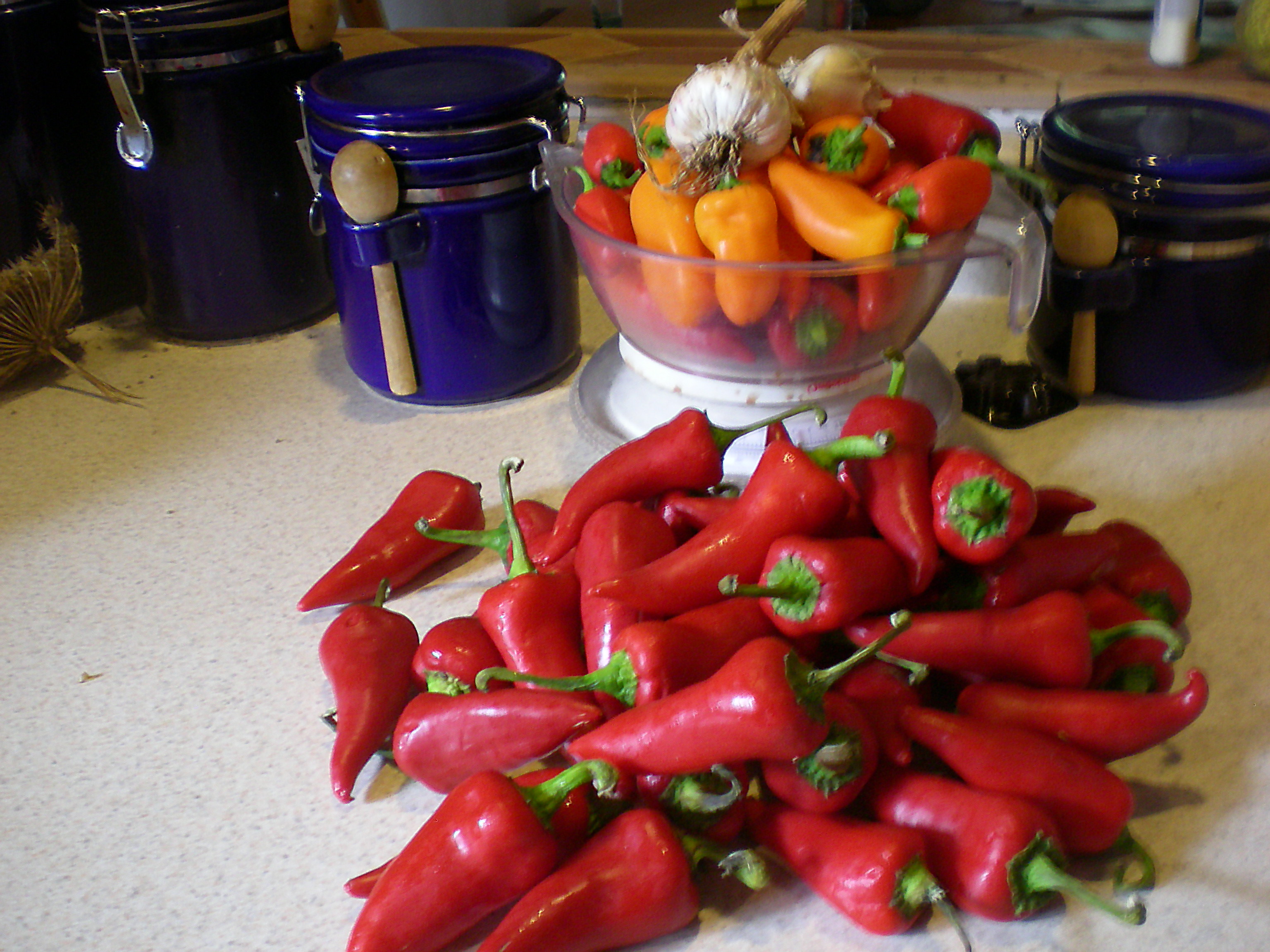- 2 1/2 pounds mixed hot red peppers (I used habaneros, jalapenos, and an unidentified hot red pepper growing in my front yard)