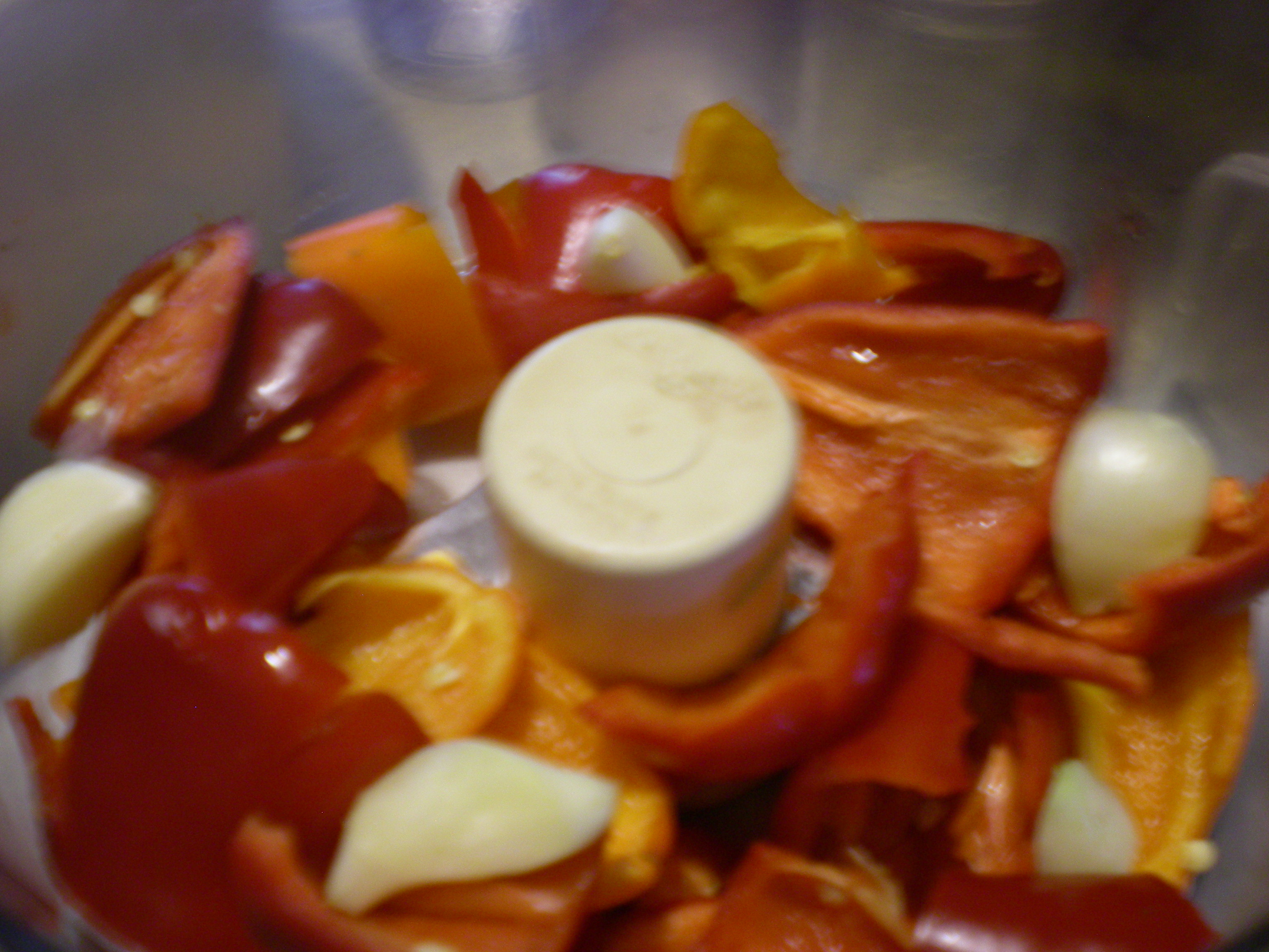 Remove the stems and seeds from the peppers (you can leave some seeds in if you want it a bit hotter). Peel the garlic.