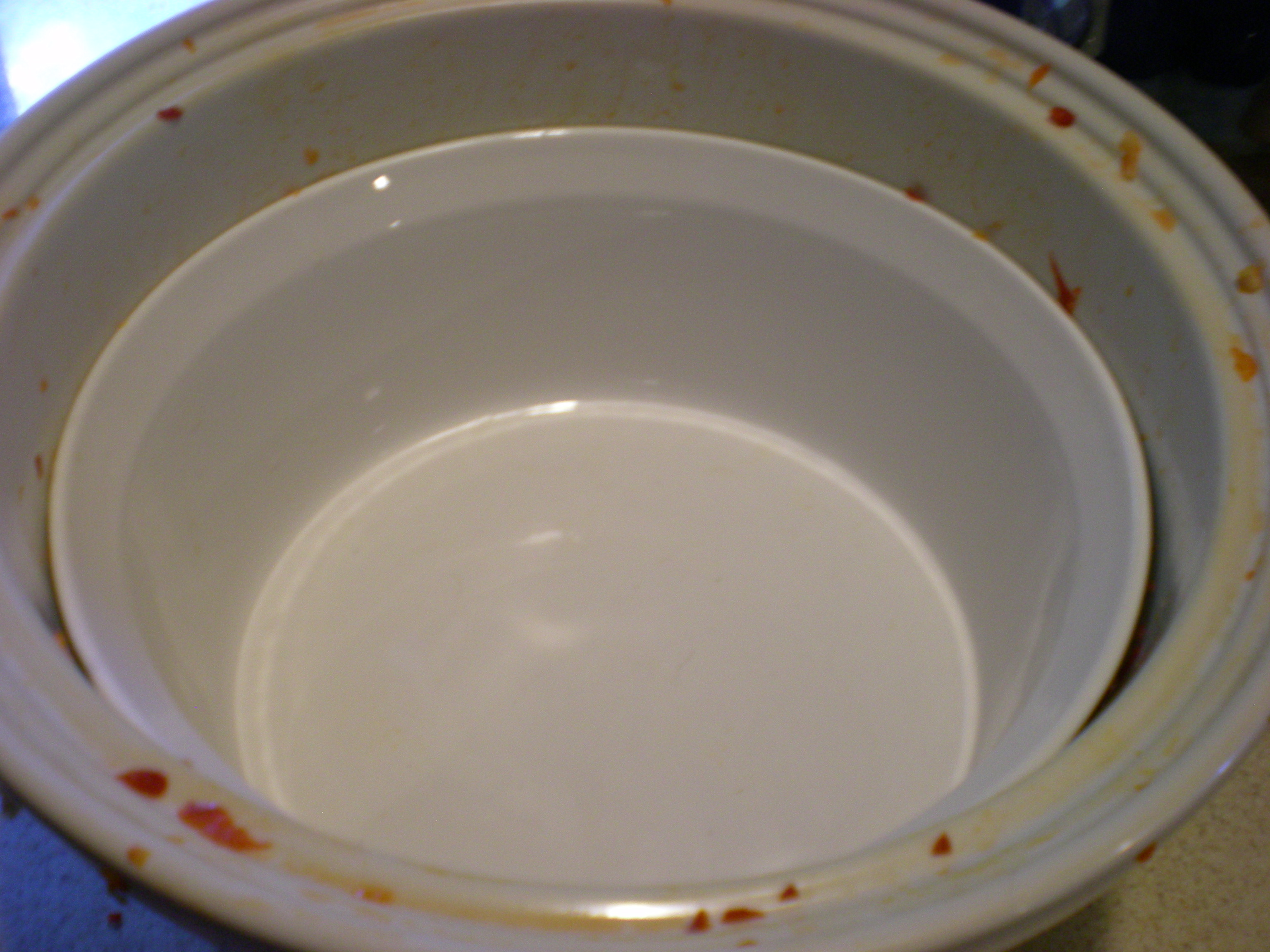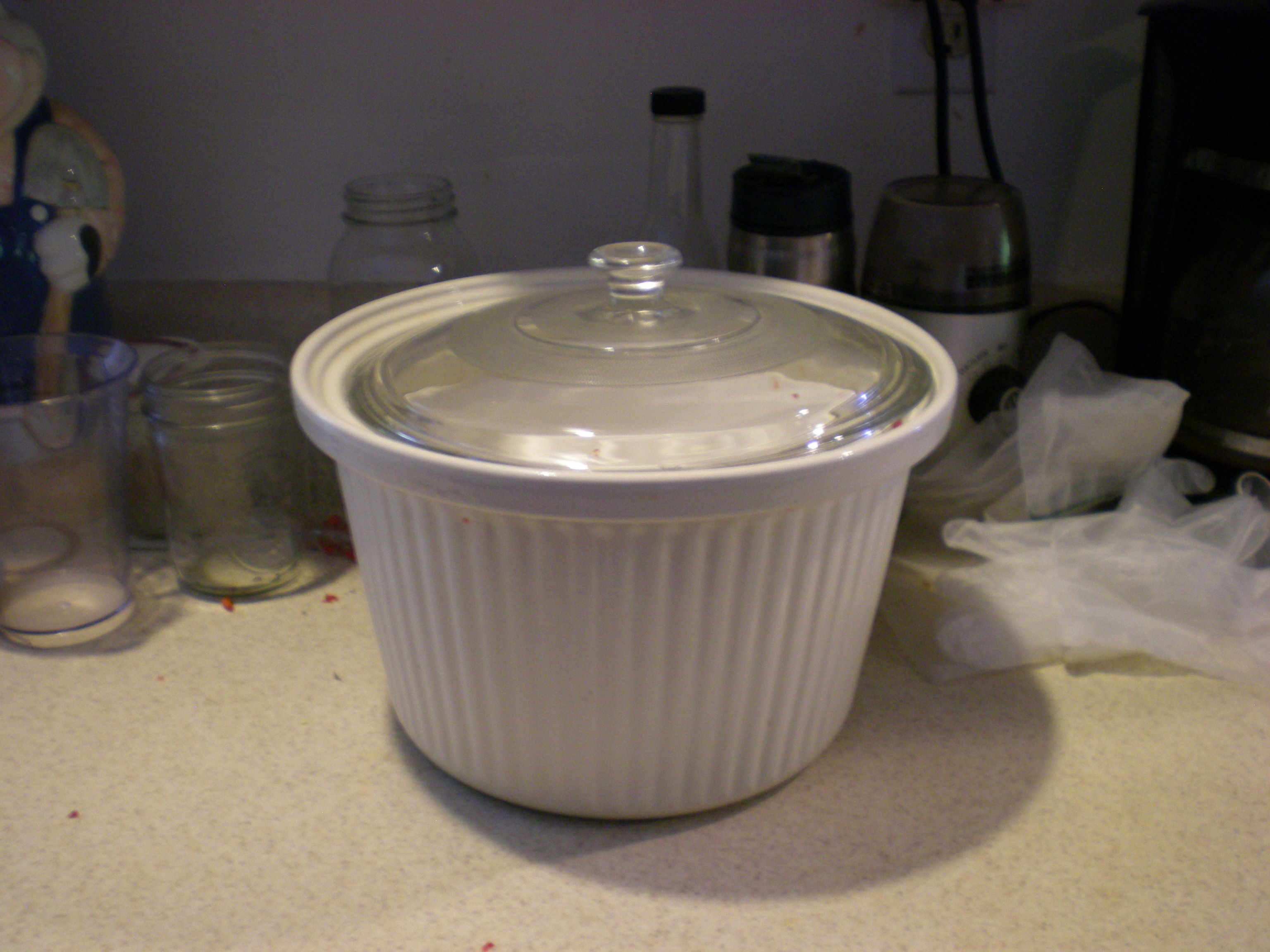 Put a weighted object on top of the peppers. The purpose is to keep the peppers below the liquid. I used a serving dish which fit exactly into my crock. TMOTH’s host family in Denmark used an ash tray to hold down their fermenting herring.