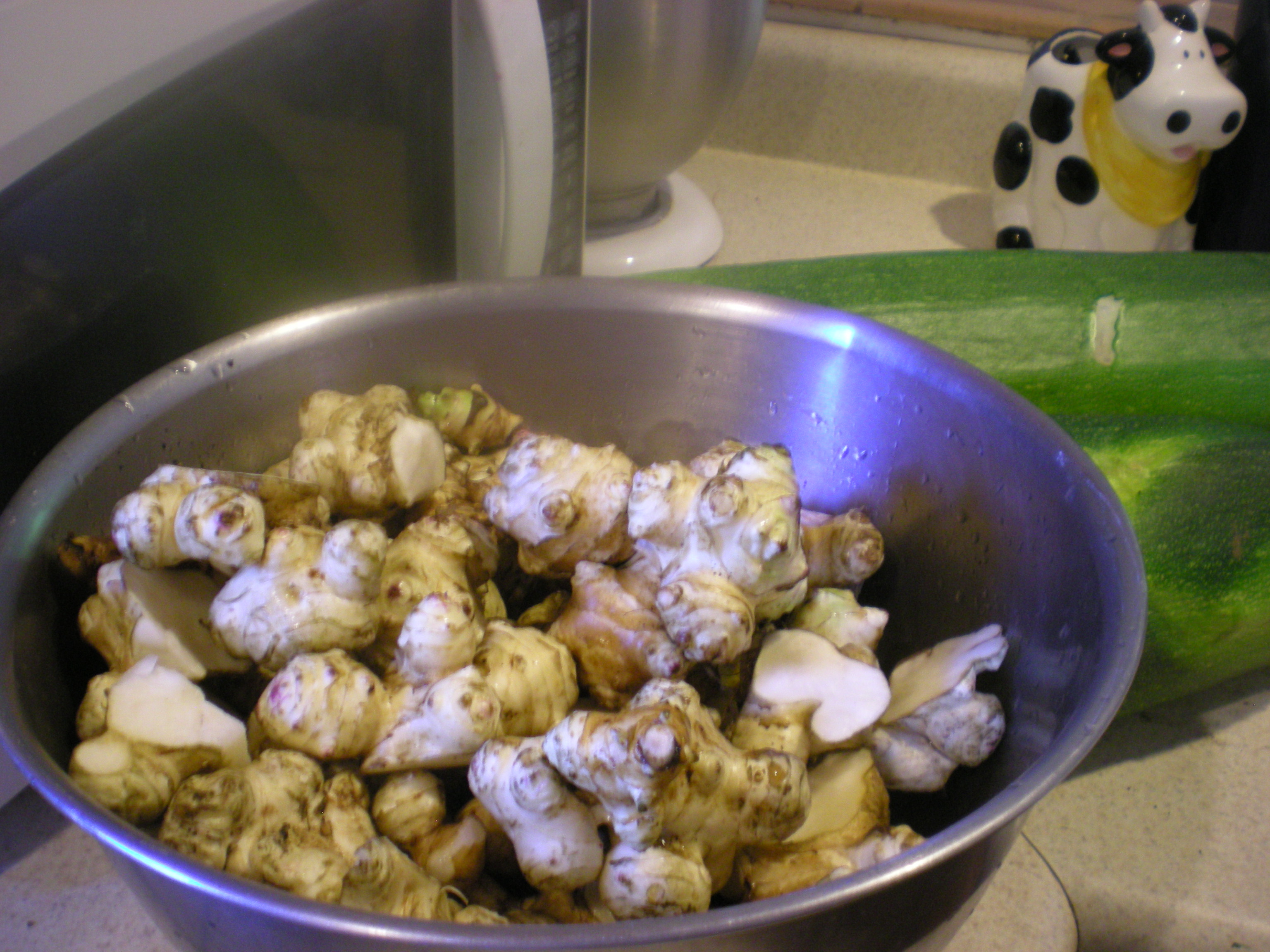 DSCN5894The metal bowl contains 5 pounds of Jerusalem Artichokes (aka Sunchokes).  I’ll make a soup tonight, and next week will feature Sunchokes fried in Sage Butter, and Roasted Sunchokes (perhaps with Blue Potatoes).